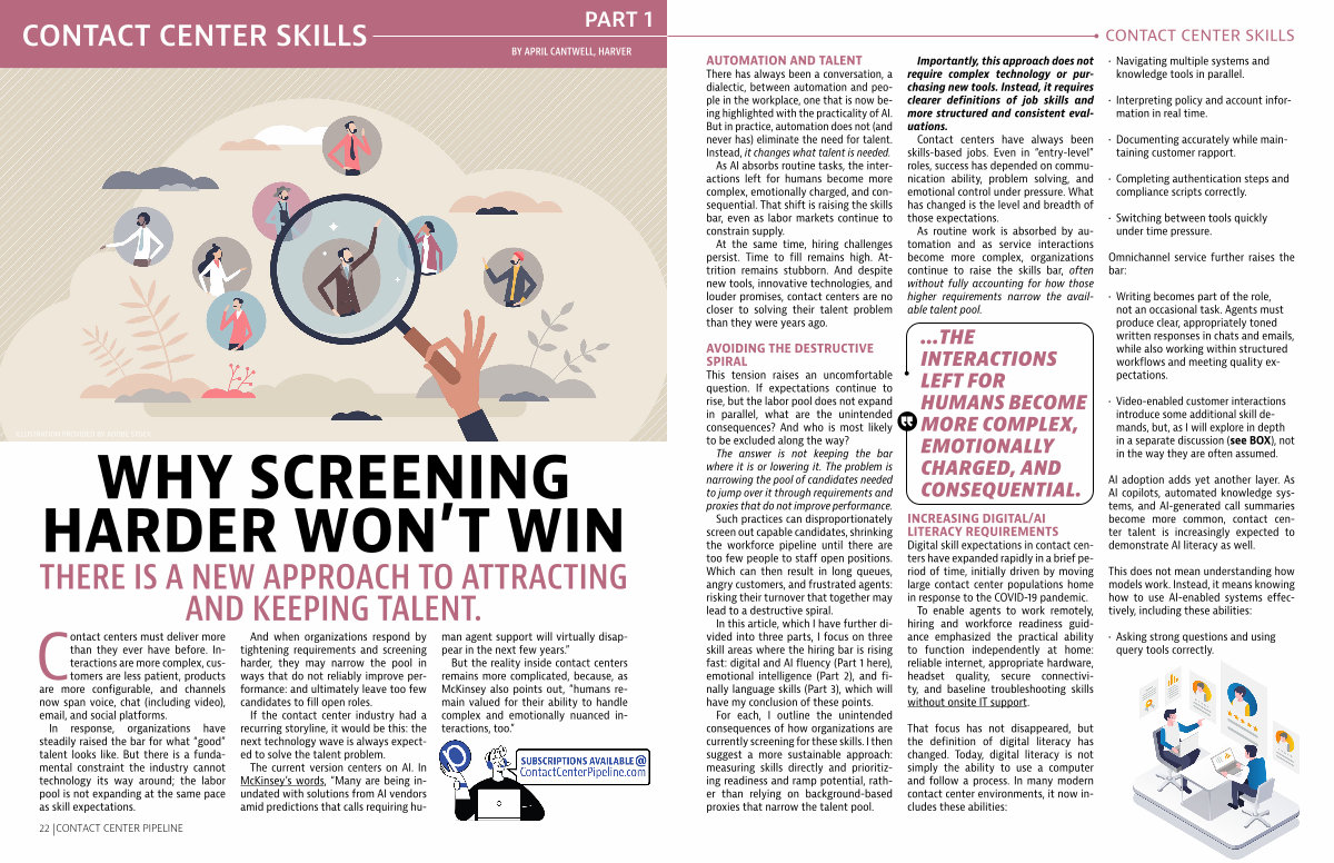 Contact centers have always been skills-based jobs. Even in“ entry-level” roles, success has depended on communication ability, problem solving, and emotional control under pressure. What has changed is the level and breadth of those expectations.