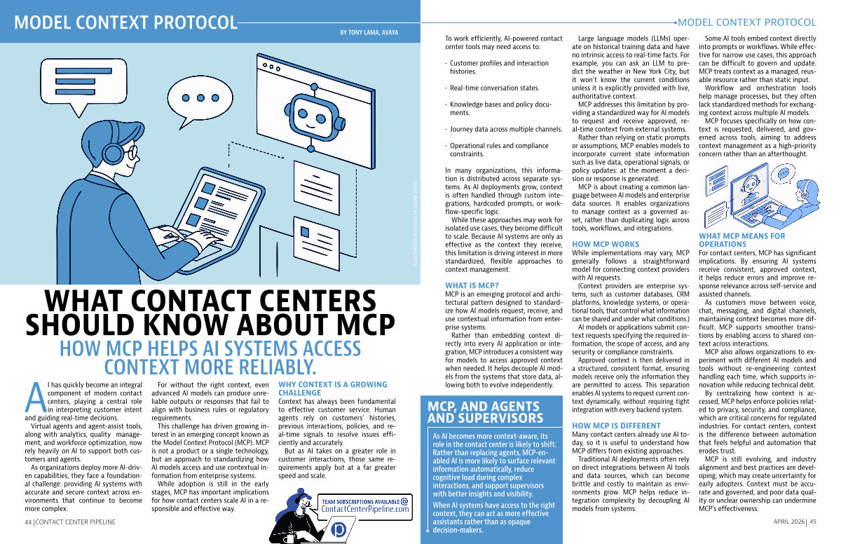 For contact centers, MCP has significant implications. By ensuring AI systems receive consistent, approved context, it helps reduce errors and improve response relevance across self-service and assisted channels.