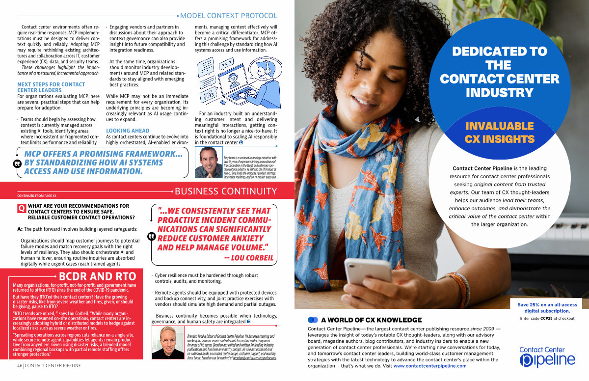 Contact Center Pipeline— the largest contact center publishing resource since 2009— leverages the insight of today’ s notable CX thought – leaders, along with our advisory board, magazine authors, blog contributors, and industry insiders to enable a new generation of contact center professionals. We’ re starting new conversations for today, and tomorrow’ s contact center leaders, building world-class customer management strategies with the latest technology to advance the contact center’ s place within the organization— that’ s what we do. Visit www. contactcenterpipeline. com