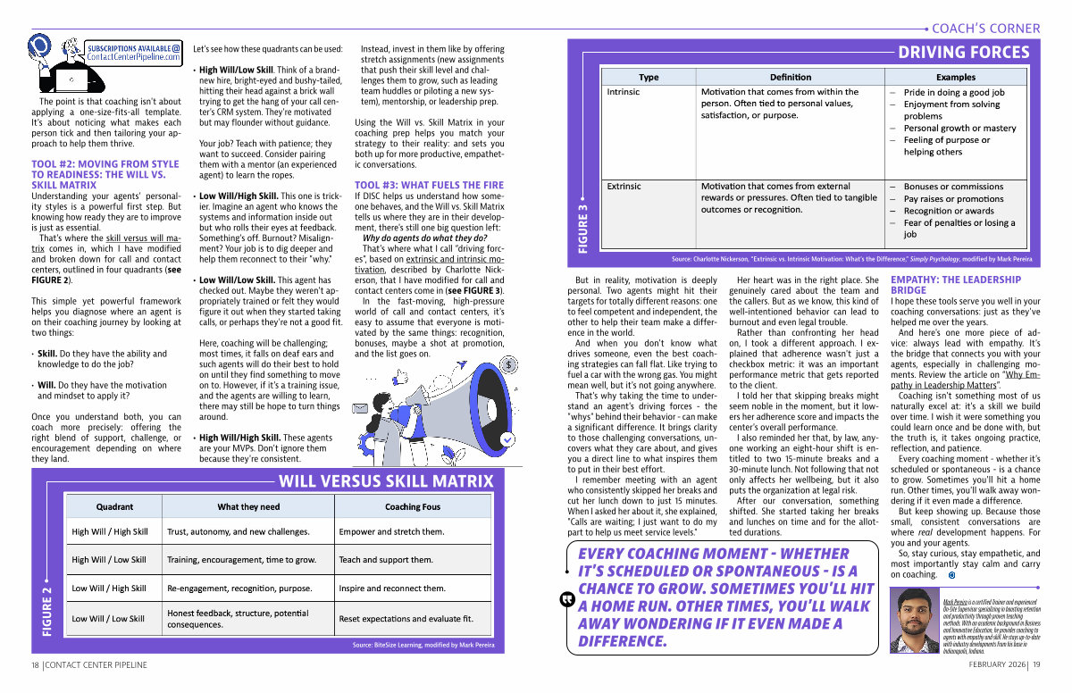 That ' s where the skill versus will matrix comes in, which I have modified and broken down for call and contact centers, outlined in four quadrants( see FIGURE 2).