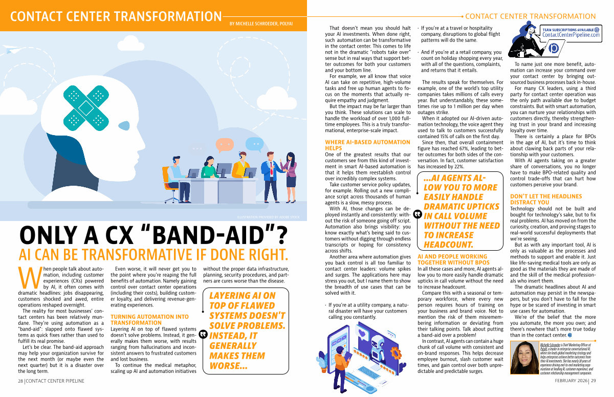When people talk about automation, including customer experiences( CXs) powered by AI, it often comes with dramatic headlines: jobs disappearing, customers shocked and awed, entire operations reshaped overnight. The reality for most businesses’ contact centers has been relatively mundane. They ' re using automation as a " band-aid ": slapped onto flawed systems as quick fixes rather than used to fulfill its real promise.