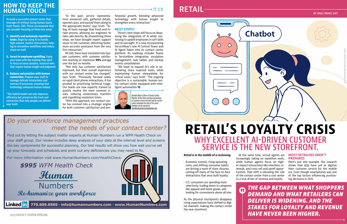 To build a successful contact center that leverages AI without losing human touch, Scott Steele, COO, Thrive recommends that you consider focusing on three key areas: