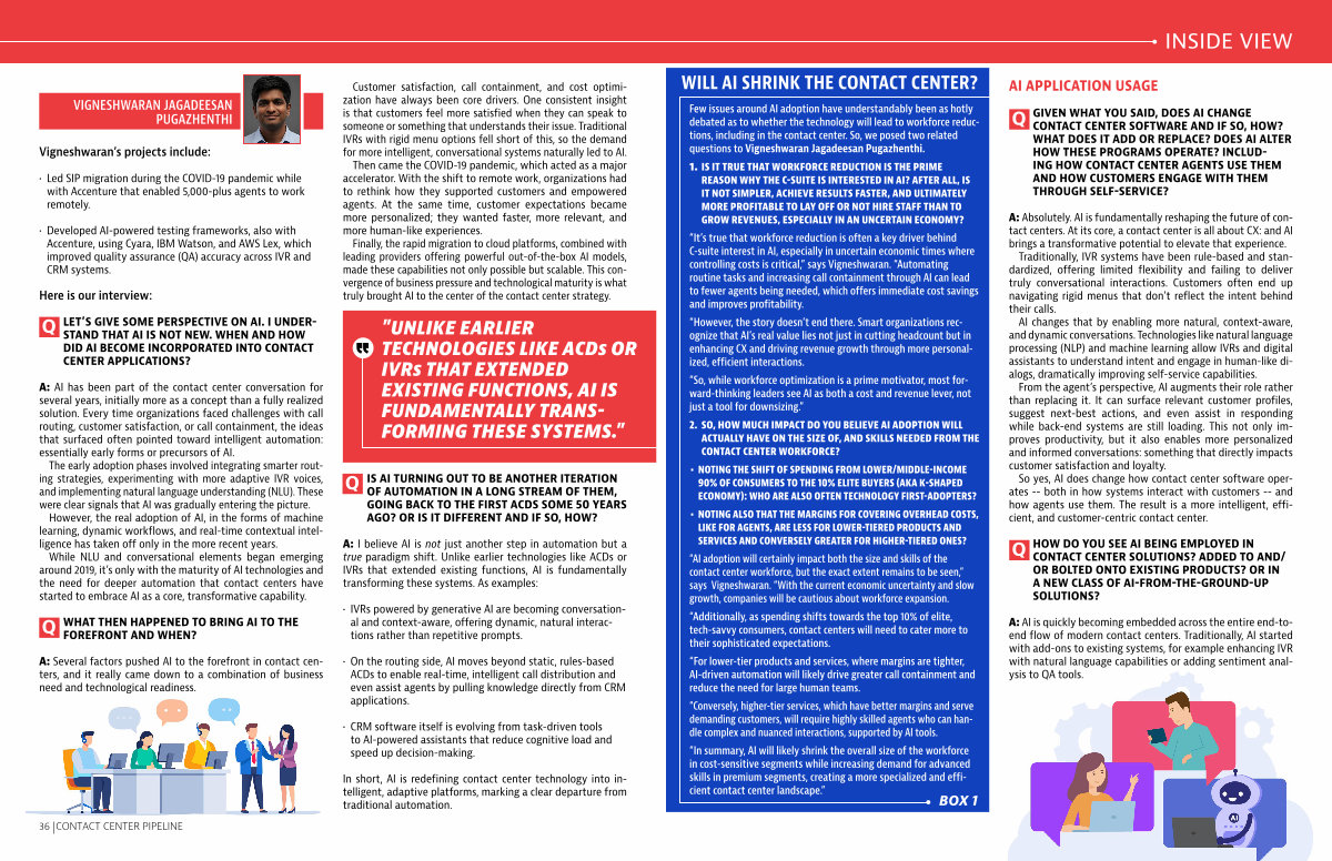 " UNLIKE EARLIER TECHNOLOGIES LIKE ACDs OR IVRs THAT EXTENDED EXISTING FUNCTIONS, AI IS FUNDAMENTALLY TRANS- FORMING THESE SYSTEMS."