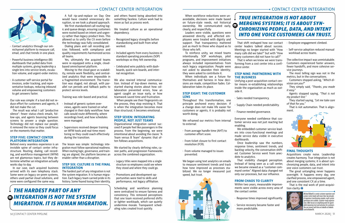 We first standardized call routing logic and queue design, ensuring customers were routed based on intent and urgency rather than legacy product lines. This allowed us to unify the CX even before the technology was fully consolidated.