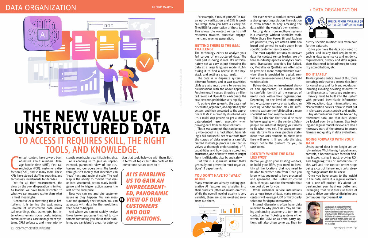 Generative AI is shattering those limitations. It is turning the vast, messy universe of unstructured data across call recordings, chat transcripts, bot interactions, emails, social posts, internal communications, case management systems, CRM software, and more into instantly searchable, quantifiable insights.