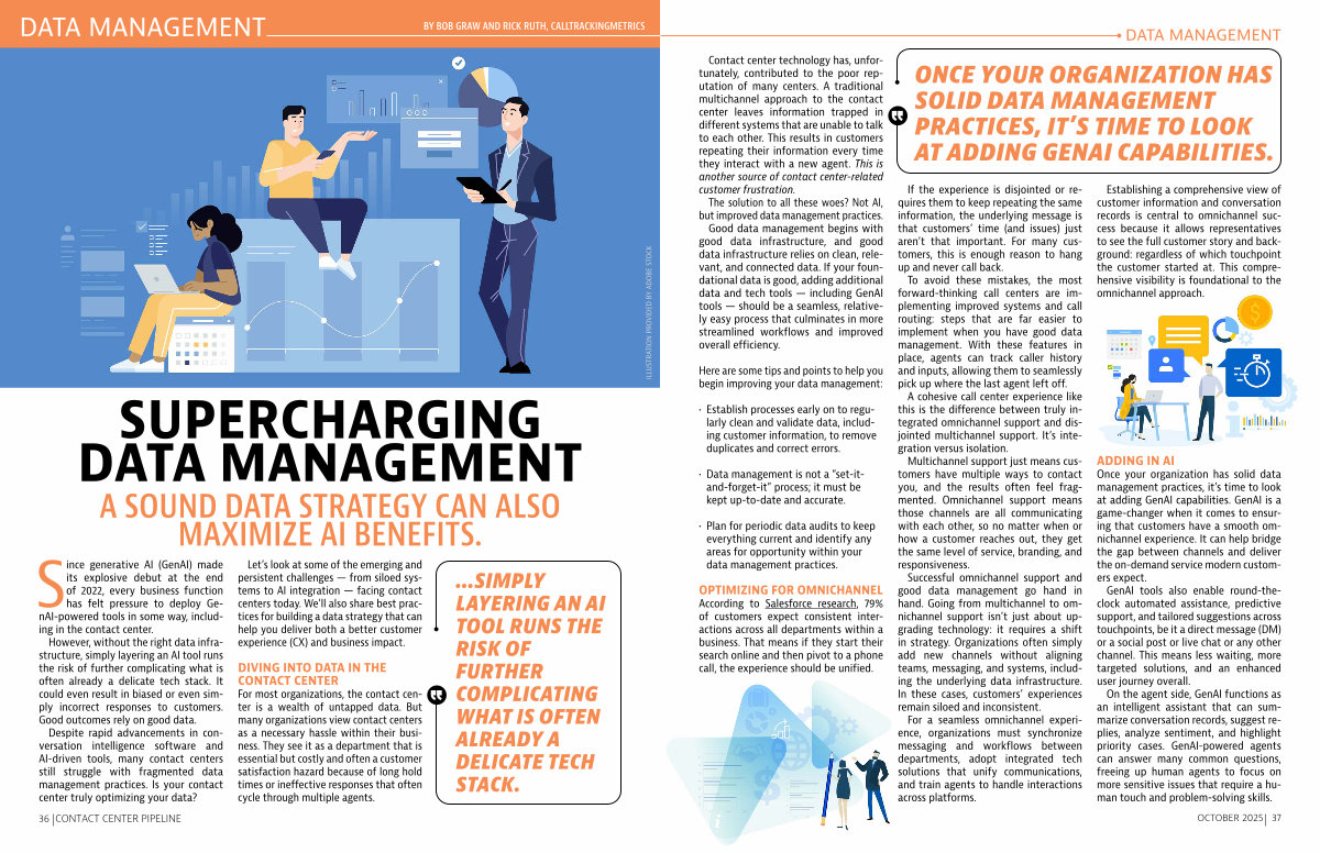 To avoid these mistakes, the most forward-thinking call centers are implementing improved systems and call routing: steps that are far easier to implement when you have good data management. With these features in place, agents can track caller history and inputs, allowing them to seamlessly pick up where the last agent left off.