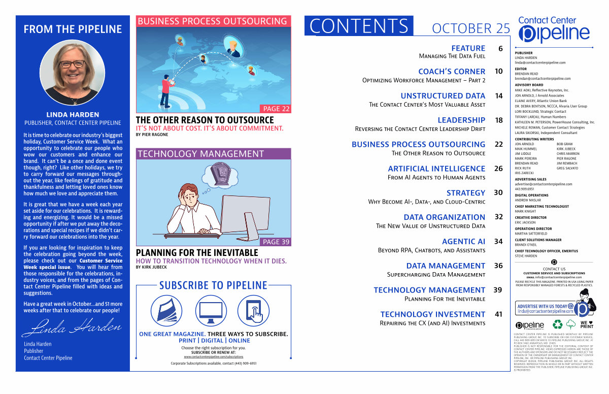 CONTACT CENTER PIPELINE IS PUBLISHED MONTHLY BY PIPELINE PUBLISHING GROUP, INC. TO SUBSCRIBE OR FOR CUSTOMER SERVICE, CALL 443-909-6951 OR WRITE TO PIPELINE PUBLISHING GROUP, INC. AT PO BOX 3467, ANNAPOLIS, MD 21403. PUBLISHER IS NOT RESPONSIBLE FOR THE EDITORIAL CONTENT OF CONTACT CENTER PIPELINE. VIEWS EXPRESSED HEREIN ARE THOSE OF THE AUTHORS AND SPONSORS AND DO NOT NECESSARILY REFLECT THE OPINION OF THE OWNERSHIP OR MANAGEMENT OF CONTACT CENTER PIPELINE, INC. OR PIPELINE PUBLISHING GROUP, INC. COPYRIGHT © 2024, PIPELINE PUBLISHING GROUP, INC. ALL RIGHTS RESERVED. REPRODUCTION IN WHOLE OR IN PART WITHOUT WRITTEN PERMISSION FROM THE PUBLISHER, PIPELINE PUBLISHING GROUP, INC. IS PROHIBITED.